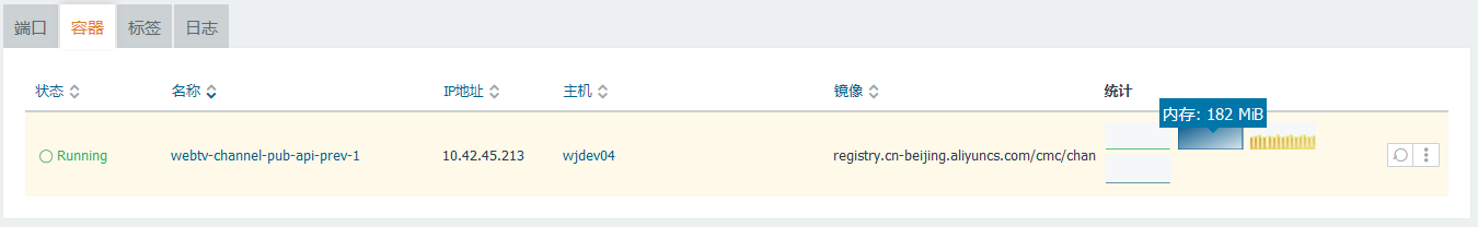 23、在产品:渠道发布中,基于同样的流程,基于 Supervisor 的 crontab (bash sleep) 的实现,注释 Yii 2 命令行中的 sleep,每3秒、每3秒、每60秒 运行一次命令,升级至开发环境,Docker 容器的 CPU:0.04%,内存:182MB,内存减少了 (289MB – 182MB) = 107MB 左右,符合预期,如图10