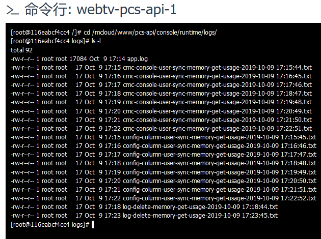 [root@b93baf1cb6ee /]# cd /mcloud/www/pcs-api/console/runtime/logs/ [root@b93baf1cb6ee logs]# ls -l total 104 -rw-r--r-- 1 root root 8549 Oct 11 11:09 app.log -rw-r--r-- 1 root root 17 Oct 11 11:09 cmc-console-user-sync-memory-get-usage-2019-10-11 11:09:21.txt -rw-r--r-- 1 root root 17 Oct 11 11:10 cmc-console-user-sync-memory-get-usage-2019-10-11 11:10:22.txt -rw-r--r-- 1 root root 17 Oct 11 11:11 cmc-console-user-sync-memory-get-usage-2019-10-11 11:11:23.txt -rw-r--r-- 1 root root 17 Oct 11 11:12 cmc-console-user-sync-memory-get-usage-2019-10-11 11:12:25.txt -rw-r--r-- 1 root root 17 Oct 11 11:13 cmc-console-user-sync-memory-get-usage-2019-10-11 11:13:26.txt -rw-r--r-- 1 root root 17 Oct 11 11:14 cmc-console-user-sync-memory-get-usage-2019-10-11 11:14:27.txt -rw-r--r-- 1 root root 17 Oct 11 11:15 cmc-console-user-sync-memory-get-usage-2019-10-11 11:15:28.txt -rw-r--r-- 1 root root 17 Oct 11 11:16 cmc-console-user-sync-memory-get-usage-2019-10-11 11:16:29.txt -rw-r--r-- 1 root root 17 Oct 11 11:17 cmc-console-user-sync-memory-get-usage-2019-10-11 11:17:30.txt -rw-r--r-- 1 root root 17 Oct 11 11:18 cmc-console-user-sync-memory-get-usage-2019-10-11 11:18:31.txt -rw-r--r-- 1 root root 17 Oct 11 11:19 cmc-console-user-sync-memory-get-usage-2019-10-11 11:19:32.txt -rw-r--r-- 1 root root 17 Oct 11 11:10 config-column-user-sync-memory-get-usage-2019-10-11 11:10:21.txt -rw-r--r-- 1 root root 17 Oct 11 11:11 config-column-user-sync-memory-get-usage-2019-10-11 11:11:22.txt -rw-r--r-- 1 root root 17 Oct 11 11:12 config-column-user-sync-memory-get-usage-2019-10-11 11:12:24.txt -rw-r--r-- 1 root root 17 Oct 11 11:13 config-column-user-sync-memory-get-usage-2019-10-11 11:13:25.txt -rw-r--r-- 1 root root 17 Oct 11 11:14 config-column-user-sync-memory-get-usage-2019-10-11 11:14:26.txt -rw-r--r-- 1 root root 17 Oct 11 11:15 config-column-user-sync-memory-get-usage-2019-10-11 11:15:27.txt -rw-r--r-- 1 root root 17 Oct 11 11:16 config-column-user-sync-memory-get-usage-2019-10-11 11:16:28.txt -rw-r--r-- 1 root root 17 Oct 11 11:17 config-column-user-sync-memory-get-usage-2019-10-11 11:17:29.txt -rw-r--r-- 1 root root 17 Oct 11 11:18 config-column-user-sync-memory-get-usage-2019-10-11 11:18:30.txt -rw-r--r-- 1 root root 17 Oct 11 11:19 config-column-user-sync-memory-get-usage-2019-10-11 11:19:31.txt -rw-r--r-- 1 root root 17 Oct 11 11:13 log-delete-memory-get-usage-2019-10-11 11:13:21.txt -rw-r--r-- 1 root root 17 Oct 11 11:18 log-delete-memory-get-usage-2019-10-11 11:18:22.txt