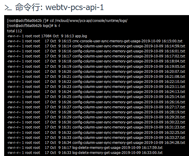 [root@adcf56a0b62b /]# cd /mcloud/www/pcs-api/console/runtime/logs/ [root@adcf56a0b62b logs]# ls -l total 112 -rw-r--r-- 1 root root 17084 Oct 9 16:13 app.log -rw-r--r-- 1 root root 17 Oct 9 16:15 cmc-console-user-sync-memory-get-usage-2019-10-09 16:15:00.txt -rw-r--r-- 1 root root 17 Oct 9 16:14 config-column-user-sync-memory-get-usage-2019-10-09 16:14:59.txt -rw-r--r-- 1 root root 17 Oct 9 16:16 config-column-user-sync-memory-get-usage-2019-10-09 16:16:01.txt -rw-r--r-- 1 root root 17 Oct 9 16:17 config-column-user-sync-memory-get-usage-2019-10-09 16:17:02.txt -rw-r--r-- 1 root root 17 Oct 9 16:18 config-column-user-sync-memory-get-usage-2019-10-09 16:18:04.txt -rw-r--r-- 1 root root 17 Oct 9 16:19 config-column-user-sync-memory-get-usage-2019-10-09 16:19:05.txt -rw-r--r-- 1 root root 17 Oct 9 16:20 config-column-user-sync-memory-get-usage-2019-10-09 16:20:07.txt -rw-r--r-- 1 root root 17 Oct 9 16:21 config-column-user-sync-memory-get-usage-2019-10-09 16:21:08.txt -rw-r--r-- 1 root root 17 Oct 9 16:22 config-column-user-sync-memory-get-usage-2019-10-09 16:22:10.txt -rw-r--r-- 1 root root 17 Oct 9 16:23 config-column-user-sync-memory-get-usage-2019-10-09 16:23:11.txt -rw-r--r-- 1 root root 17 Oct 9 16:24 config-column-user-sync-memory-get-usage-2019-10-09 16:24:13.txt -rw-r--r-- 1 root root 17 Oct 9 16:25 config-column-user-sync-memory-get-usage-2019-10-09 16:25:14.txt -rw-r--r-- 1 root root 17 Oct 9 16:26 config-column-user-sync-memory-get-usage-2019-10-09 16:26:16.txt -rw-r--r-- 1 root root 17 Oct 9 16:27 config-column-user-sync-memory-get-usage-2019-10-09 16:27:17.txt -rw-r--r-- 1 root root 17 Oct 9 16:28 config-column-user-sync-memory-get-usage-2019-10-09 16:28:19.txt -rw-r--r-- 1 root root 17 Oct 9 16:29 config-column-user-sync-memory-get-usage-2019-10-09 16:29:20.txt -rw-r--r-- 1 root root 17 Oct 9 16:30 config-column-user-sync-memory-get-usage-2019-10-09 16:30:22.txt -rw-r--r-- 1 root root 17 Oct 9 16:31 config-column-user-sync-memory-get-usage-2019-10-09 16:31:23.txt -rw-r--r-- 1 root root 17 Oct 9 16:32 config-column-user-sync-memory-get-usage-2019-10-09 16:32:25.txt -rw-r--r-- 1 root root 17 Oct 9 16:33 config-column-user-sync-memory-get-usage-2019-10-09 16:33:27.txt -rw-r--r-- 1 root root 17 Oct 9 16:34 config-column-user-sync-memory-get-usage-2019-10-09 16:34:28.txt -rw-r--r-- 1 root root 17 Oct 9 16:17 log-delete-memory-get-usage-2019-10-09 16:17:59.txt -rw-r--r-- 1 root root 17 Oct 9 16:33 log-delete-memory-get-usage-2019-10-09 16:33:00.txt