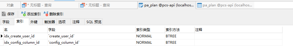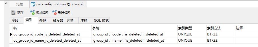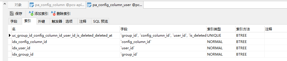 1、pa_config_column 表的索引如图1,pa_config_column_user 表的索引如图2