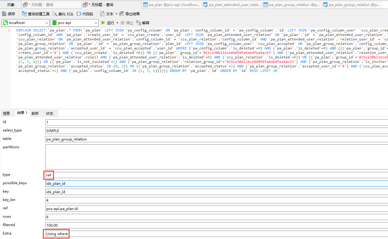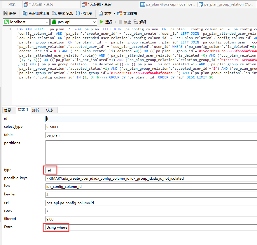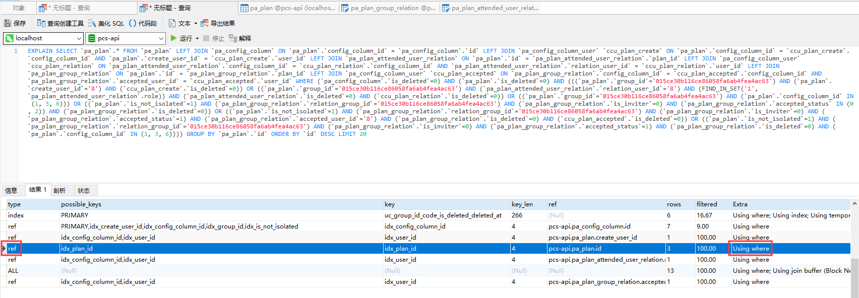 8、基于 Explain 分析 第 2 条 SQL 如下,仅查看 pa_plan 表,type 的值从 ALL 变化为 ref,Extra 的值从 Using where; Using temporary; Using filesort 变化为 Using where,性能提升明显,如图8