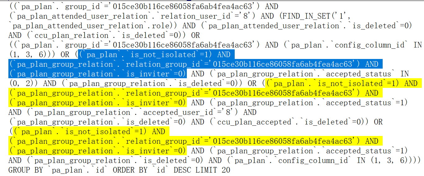EXPLAIN SELECT `pa_plan`.* FROM `pa_plan` LEFT JOIN `pa_config_column` ON `pa_plan`.`config_column_id` = `pa_config_column`.`id` LEFT JOIN `pa_config_column_user` `ccu_plan_create` ON `pa_plan`.`config_column_id` = `ccu_plan_create`.`config_column_id` AND `pa_plan`.`create_user_id` = `ccu_plan_create`.`user_id` LEFT JOIN `pa_plan_attended_user_relation` ON `pa_plan`.`id` = `pa_plan_attended_user_relation`.`plan_id` LEFT JOIN `pa_config_column_user` `ccu_plan_relation` ON `pa_plan_attended_user_relation`.`config_column_id` = `ccu_plan_relation`.`config_column_id` AND `pa_plan_attended_user_relation`.`relation_user_id` = `ccu_plan_relation`.`user_id` LEFT JOIN `pa_plan_group_relation` ON `pa_plan`.`id` = `pa_plan_group_relation`.`plan_id` LEFT JOIN `pa_config_column_user` `ccu_plan_accepted` ON `pa_plan_group_relation`.`config_column_id` = `ccu_plan_accepted`.`config_column_id` AND `pa_plan_group_relation`.`accepted_user_id` = `ccu_plan_accepted`.`user_id` WHERE (`pa_config_column`.`is_deleted`=0) AND (`pa_plan`.`is_deleted`=0) AND (((`pa_plan`.`group_id`='015ce30b116ce86058fa6ab4fea4ac63') AND (`pa_plan`.`create_user_id`='8') AND (`ccu_plan_create`.`is_deleted`=0)) OR ((`pa_plan`.`group_id`='015ce30b116ce86058fa6ab4fea4ac63') AND (`pa_plan_attended_user_relation`.`relation_user_id`='8') AND (FIND_IN_SET('1', `pa_plan_attended_user_relation`.role)) AND (`pa_plan_attended_user_relation`.`is_deleted`=0) AND (`ccu_plan_relation`.`is_deleted`=0)) OR ((`pa_plan`.`group_id`='015ce30b116ce86058fa6ab4fea4ac63') AND (`pa_plan`.`config_column_id` IN (1, 3, 6))) OR ((`pa_plan`.`is_not_isolated`=1) AND (`pa_plan_group_relation`.`relation_group_id`='015ce30b116ce86058fa6ab4fea4ac63') AND (`pa_plan_group_relation`.`is_inviter`=0) AND (`pa_plan_group_relation`.`accepted_status` IN (0, 2)) AND (`pa_plan_group_relation`.`is_deleted`=0)) OR ((`pa_plan`.`is_not_isolated`=1) AND (`pa_plan_group_relation`.`relation_group_id`='015ce30b116ce86058fa6ab4fea4ac63') AND (`pa_plan_group_relation`.`is_inviter`=0) AND (`pa_plan_group_relation`.`accepted_status`=1) AND (`pa_plan_group_relation`.`accepted_user_id`='8') AND (`pa_plan_group_relation`.`is_deleted`=0) AND (`ccu_plan_accepted`.`is_deleted`=0)) OR ((`pa_plan`.`is_not_isolated`=1) AND (`pa_plan_group_relation`.`relation_group_id`='015ce30b116ce86058fa6ab4fea4ac63') AND (`pa_plan_group_relation`.`is_inviter`=0) AND (`pa_plan_group_relation`.`accepted_status`=1) AND (`pa_plan_group_relation`.`is_deleted`=0) AND (`pa_plan`.`config_column_id` IN (1, 3, 6)))) GROUP BY `pa_plan`.`id` ORDER BY `id` DESC LIMIT 20