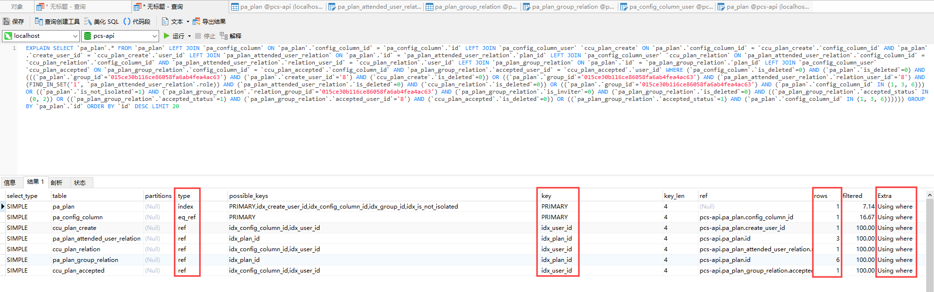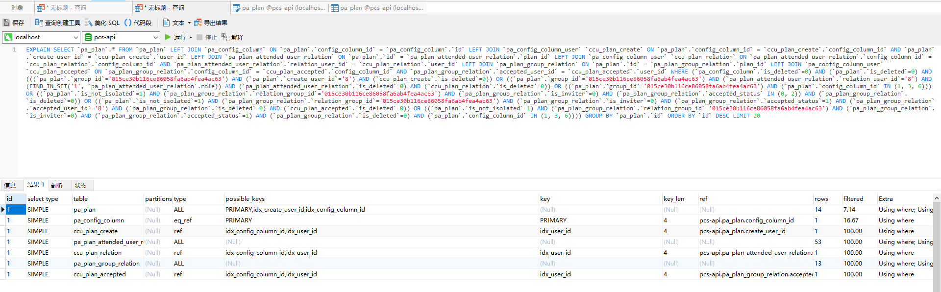 1 SIMPLE pa_plan_group_relation ref idx_plan_id idx_plan_id 4 pcs-api.pa_plan.id 6 100.00 Using where