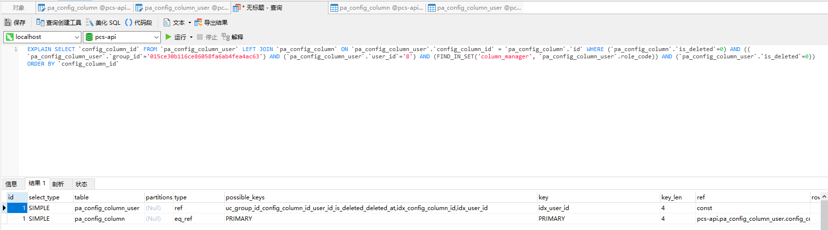 4、删除索引:idx_group_id 后,在 pa_config_column_user 表中,type 的值 从 index_merge 变化为 ref,性能提升明显