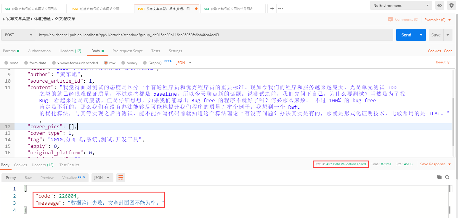 4、发布文章类型:标准(普通、图文)的文章,发布失败(即未入库,因为数据验证失败),由步骤 2 可知,即使数据验证成功(),5 条插入 SQL 语句在 1 个事务中,只要其中任意 1 条 SQL 执行失败,便会回滚,入库失败。如图4