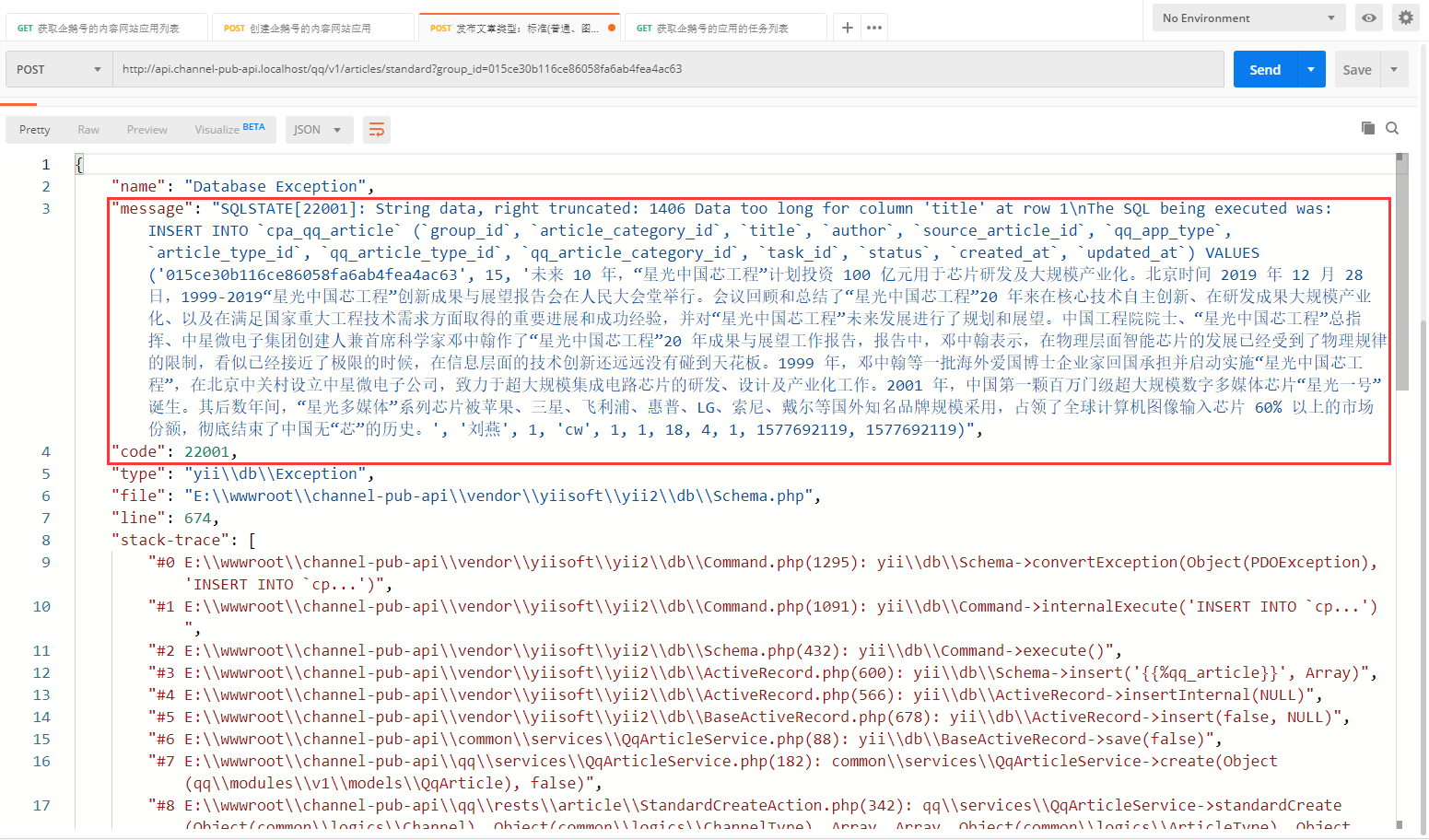 "message": "SQLSTATE[22001]: String data, right truncated: 1406 Data too long for column 'title' at row 1",