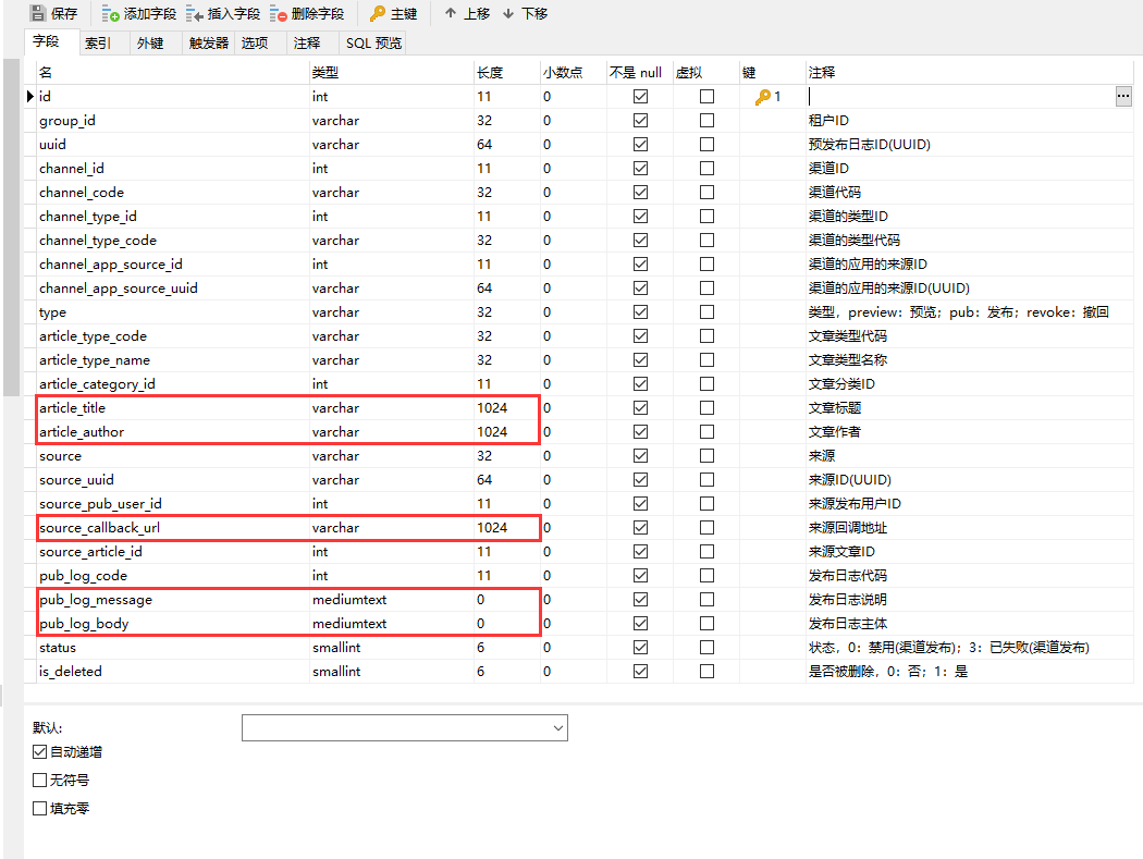 7、实施新的数据库迁移,新建表:预发布日志(pre_pub_log),最终的表结构,表中的字段类型与任务表中的字段类型保持一致,但是字符串类型的字段,加大其长度,尽可能提升其入库成功率,基于接口动作方法的返回码,当返回码不等于 10000 时,插入记录,如图7