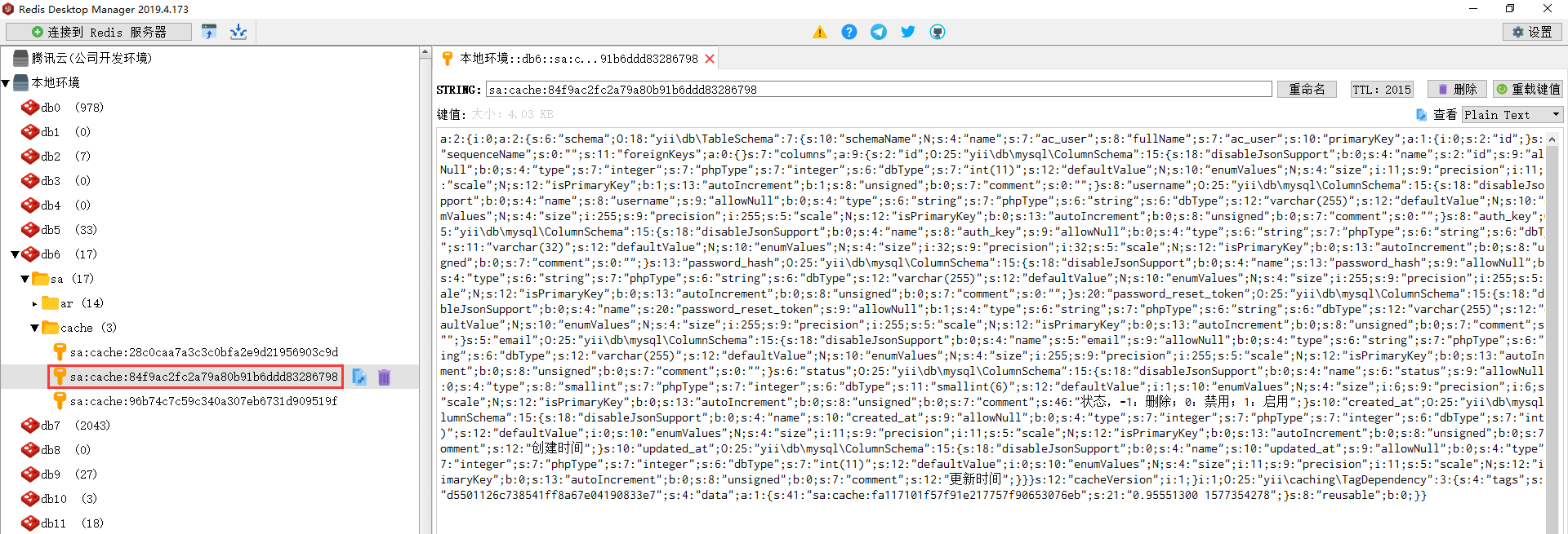 6、由于数据表结构有变更,进而导致 Schema 缓存数据 与 Schema 数据 的不一致,因此,需要清除给定连接组件的数据库表结构缓存。参考网址:https://www.yiiframework.com/doc/guide/2.0/zh-cn/caching-data ,执行控制台命令,但是查看 Redis,键名:sa:cache:84f9ac2fc2a79a80b91b6ddd83286798,发现新添加字段:is_deleted,仍然还未更新至缓存中,如图3