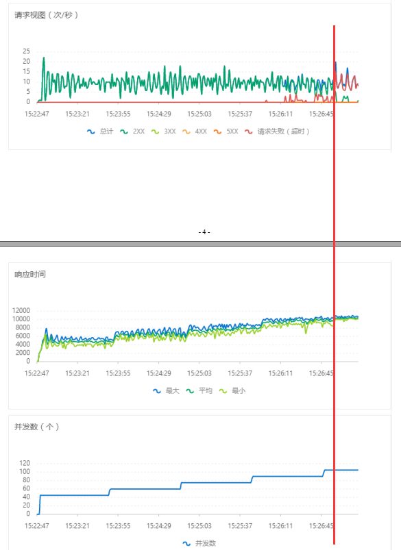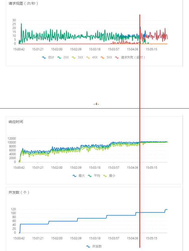 12、同一个接口(查询),在开启 Schema 缓存前,其性能测试结果,在并发数为 105 的时候,请求是一直成功的。上升至 120 ,就开始失败了。因此,可以认为其实际的并发峰值为 105,如图9