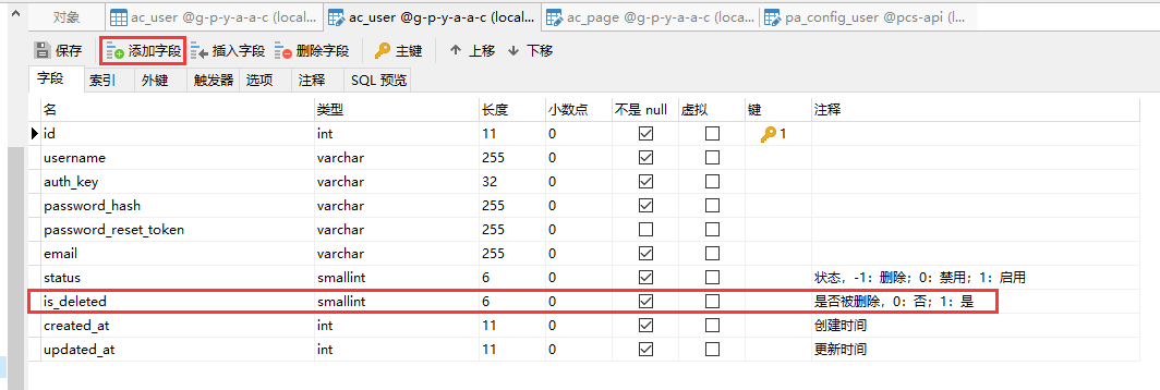 4、为了避免在执行了新的数据库迁移后,数据表结构有变更。模拟一下数据库迁移的实现手动更新表结构,添加字段:is_deleted,如图2