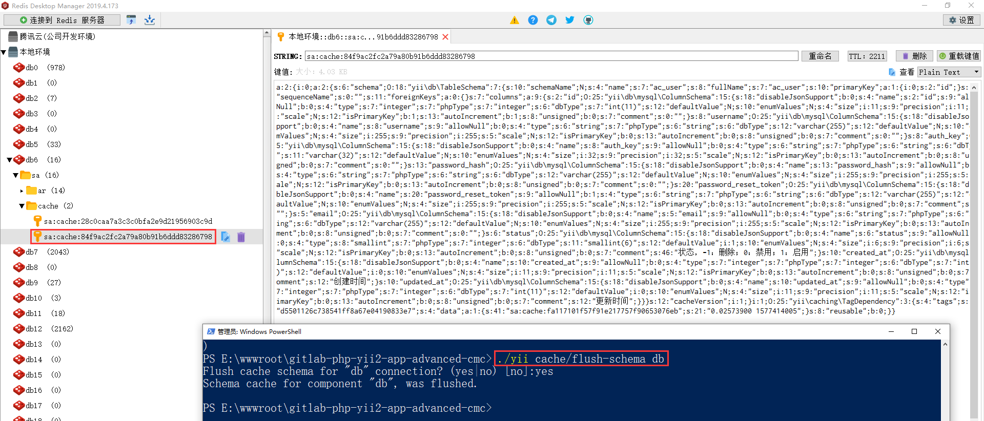 PS E:\wwwroot\gitlab-php-yii2-app-advanced-cmc> ./yii cache/flush-schema db Flush cache schema for "db" connection? (yes|no) [no]:yes Schema cache for component "db", was flushed.