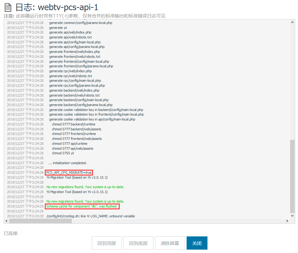 10、基于 Rancher 升级容器时,在应用运行的环境为生产环境,即 YII_ENV 的值为 prod 时,查看升级日志,Schema cache for component “db”, was flushed.,如图7