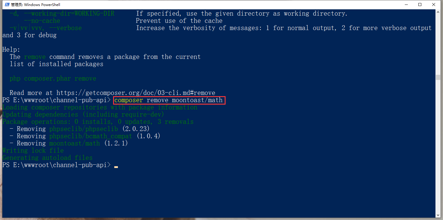 PS E:\wwwroot\channel-pub-api> composer remove moontoast/math Loading composer repositories with package information Updating dependencies (including require-dev) Package operations: 0 installs, 0 updates, 3 removals - Removing phpseclib/phpseclib (2.0.23) - Removing phpseclib/bcmath_compat (1.0.4) - Removing moontoast/math (1.2.1) Writing lock file Generating autoload files