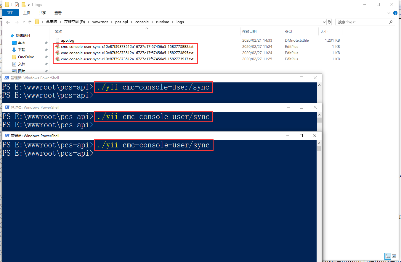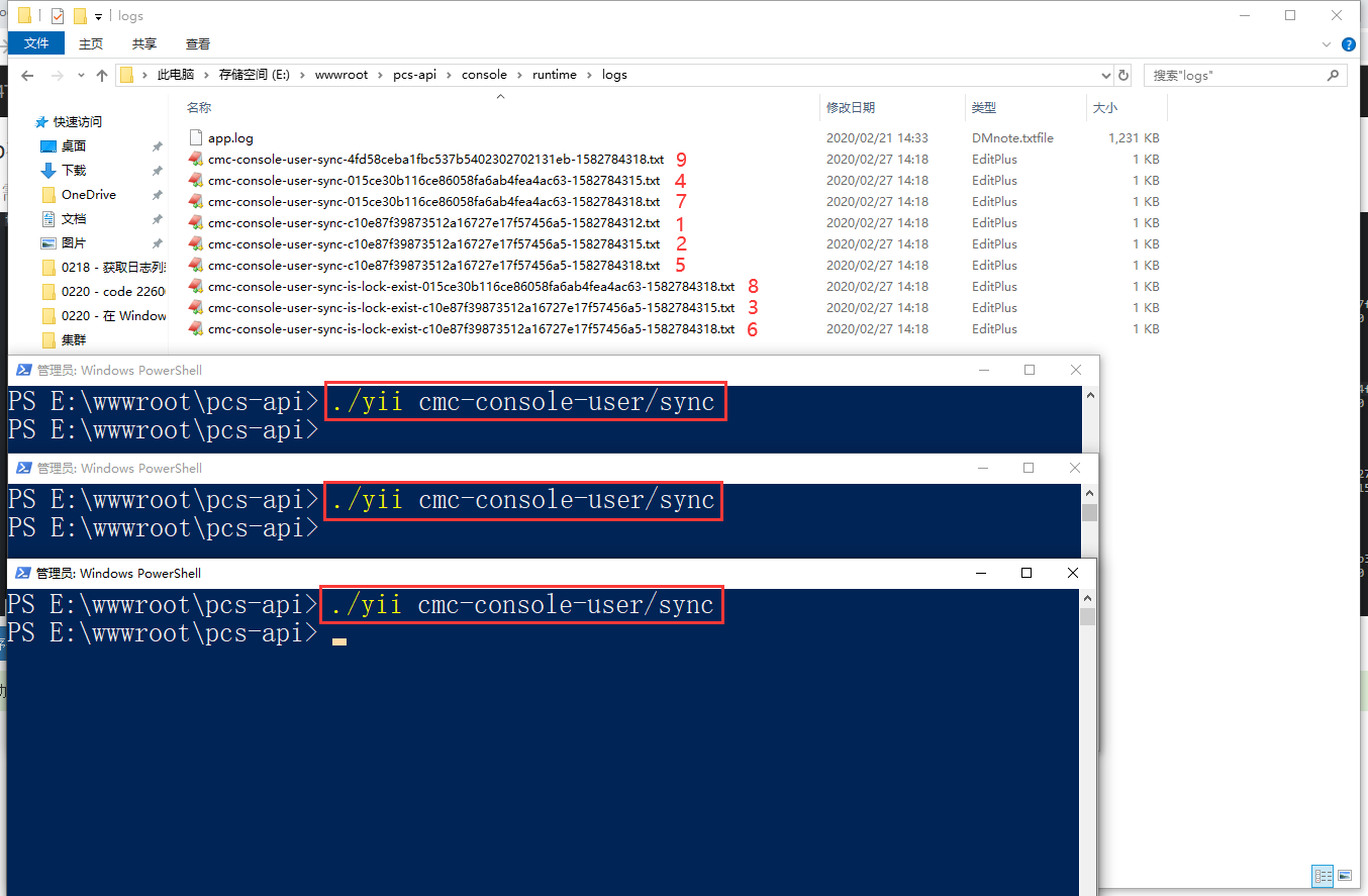 8、当一个租户下的用户同步时间长度小于等于 Redis锁定超时时间 的值 10秒时(sleep(8),实际长度超过了 8 秒),此时,此租户已经处于锁定状态,进而导致部署为集群时,可以保证同一个租户下的用户同步,在某一时间段,仅在 1 个容器中执行。在本地环境中,模拟了 3 个容器,3 个容器开始同步时间:1582784312、1582784315、1582784318,分别间隔 3 秒、3秒,皆小于 10 秒。第 1 个容器同步了租户:c10e87f39873512a16727e17f57456a5,第 2 个容器同步了租户:015ce30b116ce86058fa6ab4fea4ac63,第 3 个容器同步了租户:4fd58ceba1fbc537b5402302702131eb。3 个容器的并行执行,分别同步了 3 个租户,符合预期。文件生成顺序体现出了执行执行流程。如图1