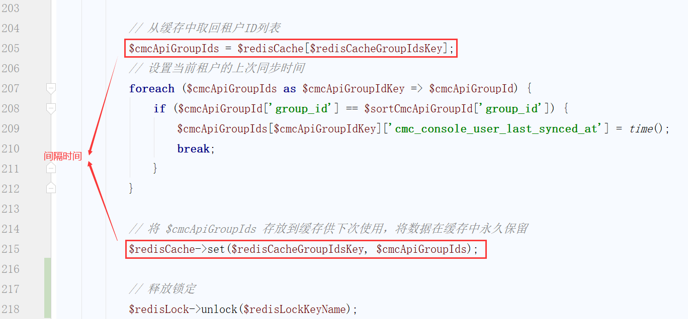 9、打印出从缓存中取回租户ID列表,已经成功同步了 3 个租户:c10e87f39873512a16727e17f57456a5、015ce30b116ce86058fa6ab4fea4ac63、4fd58ceba1fbc537b5402302702131eb,但是,仅有租户 4fd58ceba1fbc537b5402302702131eb 的同步时间得到了更新。虽然在实际的生产环境中,不存在 sleep(8),此为在本地环境模拟并发请求,而添加的。但是,理论上来说,从缓存中取回租户ID列表,到 将 $cmcApiGroupIds 存放到缓存供下次使用,将数据在缓存中永久保留 的间隔时间段(假设租户数量为 10000 个,则遍历 10000 次,时间间隔为 30000 微秒,即 0.03 秒)内,如果存在 多个容器 在运行的话,便会出现相互覆盖的情况。暂时不做处理,即时出现了相互覆盖的情况,其后果是可以接受的。租户:c10e87f39873512a16727e17f57456a5、015ce30b116ce86058fa6ab4fea4ac63 会相继立即重复同步一次。如图2