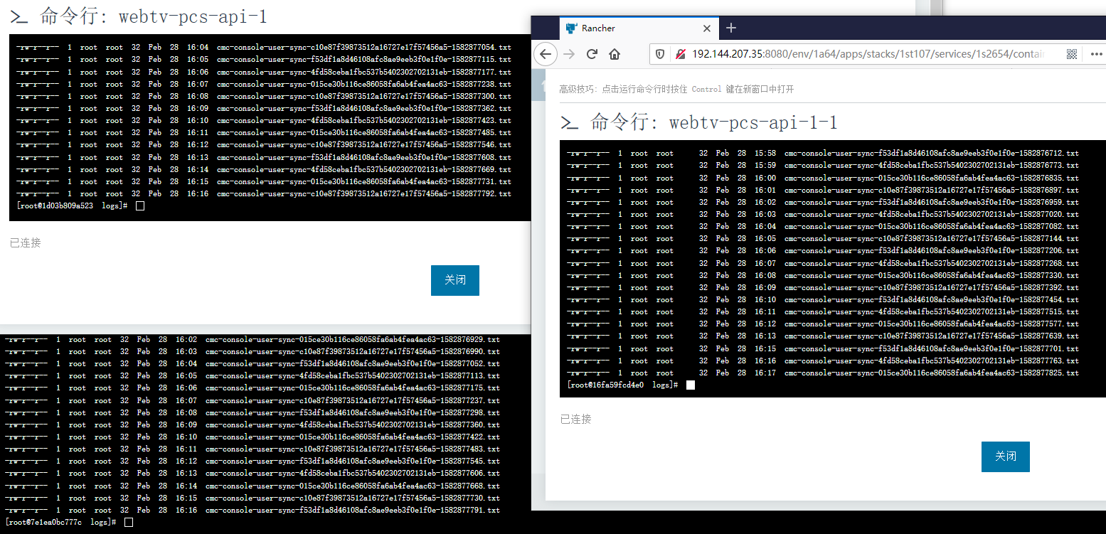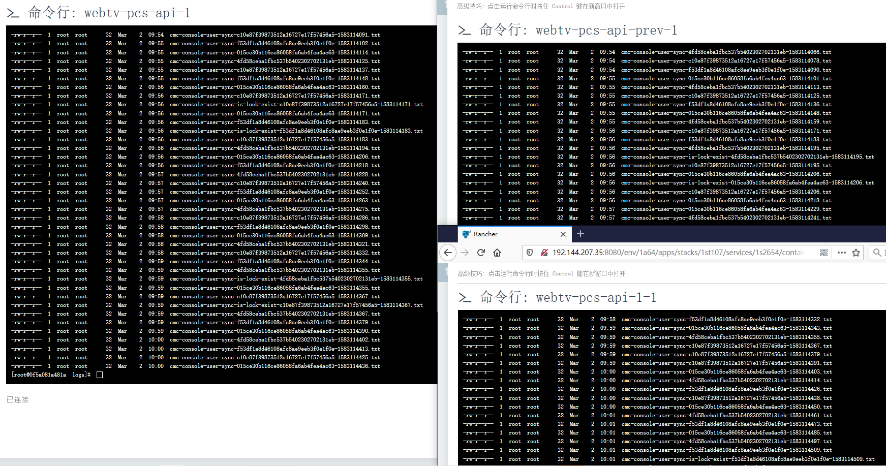 [root@0f5a081a481a logs]# ls -ltr total 320 -rw-r--r-- 1 root root 8845 Mar 2 09:50 app.log -rw-r--r-- 1 root root 32 Mar 2 09:50 cmc-console-user-sync-4fd58ceba1fbc537b5402302702131eb-1583113813.txt -rw-r--r-- 1 root root 32 Mar 2 09:50 cmc-console-user-sync-f53df1a8d46108afc8ae9eeb3f0e1f0e-1583113825.txt -rw-r--r-- 1 root root 32 Mar 2 09:50 cmc-console-user-sync-015ce30b116ce86058fa6ab4fea4ac63-1583113836.txt -rw-r--r-- 1 root root 32 Mar 2 09:50 cmc-console-user-sync-4fd58ceba1fbc537b5402302702131eb-1583113848.txt -rw-r--r-- 1 root root 32 Mar 2 09:51 cmc-console-user-sync-c10e87f39873512a16727e17f57456a5-1583113860.txt -rw-r--r-- 1 root root 32 Mar 2 09:51 cmc-console-user-sync-f53df1a8d46108afc8ae9eeb3f0e1f0e-1583113871.txt -rw-r--r-- 1 root root 32 Mar 2 09:51 cmc-console-user-sync-015ce30b116ce86058fa6ab4fea4ac63-1583113883.txt -rw-r--r-- 1 root root 32 Mar 2 09:51 cmc-console-user-sync-4fd58ceba1fbc537b5402302702131eb-1583113894.txt -rw-r--r-- 1 root root 32 Mar 2 09:51 cmc-console-user-sync-c10e87f39873512a16727e17f57456a5-1583113906.txt -rw-r--r-- 1 root root 32 Mar 2 09:51 cmc-console-user-sync-f53df1a8d46108afc8ae9eeb3f0e1f0e-1583113917.txt -rw-r--r-- 1 root root 32 Mar 2 09:52 cmc-console-user-sync-015ce30b116ce86058fa6ab4fea4ac63-1583113929.txt -rw-r--r-- 1 root root 32 Mar 2 09:52 cmc-console-user-sync-4fd58ceba1fbc537b5402302702131eb-1583113940.txt -rw-r--r-- 1 root root 32 Mar 2 09:52 cmc-console-user-sync-c10e87f39873512a16727e17f57456a5-1583113952.txt -rw-r--r-- 1 root root 32 Mar 2 09:52 cmc-console-user-sync-f53df1a8d46108afc8ae9eeb3f0e1f0e-1583113964.txt -rw-r--r-- 1 root root 32 Mar 2 09:52 cmc-console-user-sync-015ce30b116ce86058fa6ab4fea4ac63-1583113975.txt -rw-r--r-- 1 root root 32 Mar 2 09:53 cmc-console-user-sync-4fd58ceba1fbc537b5402302702131eb-1583113987.txt -rw-r--r-- 1 root root 32 Mar 2 09:53 cmc-console-user-sync-c10e87f39873512a16727e17f57456a5-1583113998.txt -rw-r--r-- 1 root root 32 Mar 2 09:53 cmc-console-user-sync-f53df1a8d46108afc8ae9eeb3f0e1f0e-1583114010.txt -rw-r--r-- 1 root root 32 Mar 2 09:53 cmc-console-user-sync-015ce30b116ce86058fa6ab4fea4ac63-1583114021.txt -rw-r--r-- 1 root root 32 Mar 2 09:53 cmc-console-user-sync-4fd58ceba1fbc537b5402302702131eb-1583114033.txt -rw-r--r-- 1 root root 32 Mar 2 09:54 cmc-console-user-sync-c10e87f39873512a16727e17f57456a5-1583114044.txt -rw-r--r-- 1 root root 32 Mar 2 09:54 cmc-console-user-sync-f53df1a8d46108afc8ae9eeb3f0e1f0e-1583114056.txt -rw-r--r-- 1 root root 32 Mar 2 09:54 cmc-console-user-sync-015ce30b116ce86058fa6ab4fea4ac63-1583114067.txt -rw-r--r-- 1 root root 32 Mar 2 09:54 cmc-console-user-sync-4fd58ceba1fbc537b5402302702131eb-1583114079.txt -rw-r--r-- 1 root root 32 Mar 2 09:54 cmc-console-user-sync-c10e87f39873512a16727e17f57456a5-1583114091.txt -rw-r--r-- 1 root root 32 Mar 2 09:55 cmc-console-user-sync-f53df1a8d46108afc8ae9eeb3f0e1f0e-1583114102.txt -rw-r--r-- 1 root root 32 Mar 2 09:55 cmc-console-user-sync-015ce30b116ce86058fa6ab4fea4ac63-1583114114.txt -rw-r--r-- 1 root root 32 Mar 2 09:55 cmc-console-user-sync-4fd58ceba1fbc537b5402302702131eb-1583114125.txt -rw-r--r-- 1 root root 32 Mar 2 09:55 cmc-console-user-sync-c10e87f39873512a16727e17f57456a5-1583114137.txt -rw-r--r-- 1 root root 32 Mar 2 09:55 cmc-console-user-sync-f53df1a8d46108afc8ae9eeb3f0e1f0e-1583114148.txt -rw-r--r-- 1 root root 32 Mar 2 09:56 cmc-console-user-sync-015ce30b116ce86058fa6ab4fea4ac63-1583114160.txt -rw-r--r-- 1 root root 32 Mar 2 09:56 cmc-console-user-sync-c10e87f39873512a16727e17f57456a5-1583114171.txt -rw-r--r-- 1 root root 32 Mar 2 09:56 cmc-console-user-sync-is-lock-exist-c10e87f39873512a16727e17f57456a5-1583114171.txt -rw-r--r-- 1 root root 32 Mar 2 09:56 cmc-console-user-sync-015ce30b116ce86058fa6ab4fea4ac63-1583114171.txt -rw-r--r-- 1 root root 32 Mar 2 09:56 cmc-console-user-sync-f53df1a8d46108afc8ae9eeb3f0e1f0e-1583114183.txt -rw-r--r-- 1 root root 32 Mar 2 09:56 cmc-console-user-sync-is-lock-exist-f53df1a8d46108afc8ae9eeb3f0e1f0e-1583114183.txt -rw-r--r-- 1 root root 32 Mar 2 09:56 cmc-console-user-sync-c10e87f39873512a16727e17f57456a5-1583114183.txt -rw-r--r-- 1 root root 32 Mar 2 09:56 cmc-console-user-sync-4fd58ceba1fbc537b5402302702131eb-1583114194.txt -rw-r--r-- 1 root root 32 Mar 2 09:56 cmc-console-user-sync-015ce30b116ce86058fa6ab4fea4ac63-1583114206.txt -rw-r--r-- 1 root root 32 Mar 2 09:56 cmc-console-user-sync-f53df1a8d46108afc8ae9eeb3f0e1f0e-1583114218.txt -rw-r--r-- 1 root root 32 Mar 2 09:57 cmc-console-user-sync-4fd58ceba1fbc537b5402302702131eb-1583114228.txt -rw-r--r-- 1 root root 32 Mar 2 09:57 cmc-console-user-sync-c10e87f39873512a16727e17f57456a5-1583114240.txt -rw-r--r-- 1 root root 32 Mar 2 09:57 cmc-console-user-sync-f53df1a8d46108afc8ae9eeb3f0e1f0e-1583114252.txt -rw-r--r-- 1 root root 32 Mar 2 09:57 cmc-console-user-sync-015ce30b116ce86058fa6ab4fea4ac63-1583114263.txt -rw-r--r-- 1 root root 32 Mar 2 09:57 cmc-console-user-sync-4fd58ceba1fbc537b5402302702131eb-1583114275.txt -rw-r--r-- 1 root root 32 Mar 2 09:58 cmc-console-user-sync-c10e87f39873512a16727e17f57456a5-1583114286.txt -rw-r--r-- 1 root root 32 Mar 2 09:58 cmc-console-user-sync-f53df1a8d46108afc8ae9eeb3f0e1f0e-1583114298.txt -rw-r--r-- 1 root root 32 Mar 2 09:58 cmc-console-user-sync-015ce30b116ce86058fa6ab4fea4ac63-1583114309.txt -rw-r--r-- 1 root root 32 Mar 2 09:58 cmc-console-user-sync-4fd58ceba1fbc537b5402302702131eb-1583114321.txt -rw-r--r-- 1 root root 32 Mar 2 09:58 cmc-console-user-sync-c10e87f39873512a16727e17f57456a5-1583114332.txt -rw-r--r-- 1 root root 32 Mar 2 09:59 cmc-console-user-sync-f53df1a8d46108afc8ae9eeb3f0e1f0e-1583114344.txt -rw-r--r-- 1 root root 32 Mar 2 09:59 cmc-console-user-sync-4fd58ceba1fbc537b5402302702131eb-1583114355.txt -rw-r--r-- 1 root root 32 Mar 2 09:59 cmc-console-user-sync-is-lock-exist-4fd58ceba1fbc537b5402302702131eb-1583114355.txt -rw-r--r-- 1 root root 32 Mar 2 09:59 cmc-console-user-sync-015ce30b116ce86058fa6ab4fea4ac63-1583114355.txt -rw-r--r-- 1 root root 32 Mar 2 09
