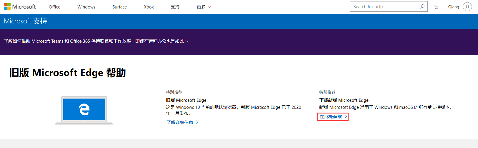 1、打开 帮助和反馈 – 帮助 页面,这是 Windows 10 当前的默认浏览器。新版 Microsoft Edge 已于 2020 年 1 月发布。下载新版 Microsoft Edge,如图1