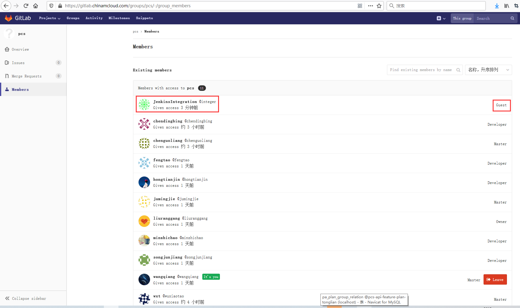 4、在组 pcs 下的用户列表,添加用户:JenkinsIntegration,身份为:Guest,如图3