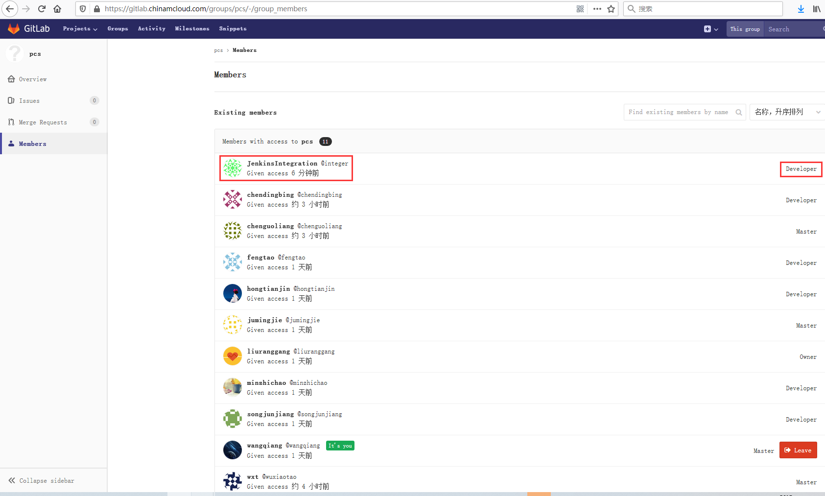 6、在组 pcs 下的用户列表,修改用户:JenkinsIntegration,身份为:Developer,如图4