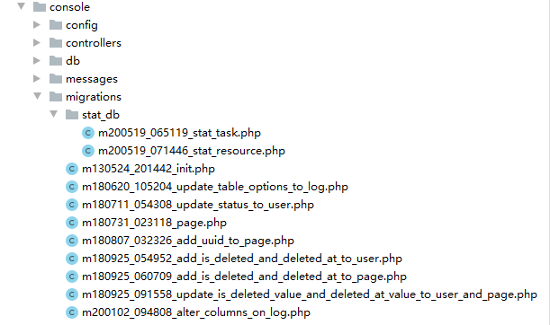 2、迁移多个数据库的策略是把迁移存放到不同的目录下。一个连接组件对应一个目录。db 的目录:/console/migrations/。statDb 的目录:/console/migrations/stat_db/。如图1