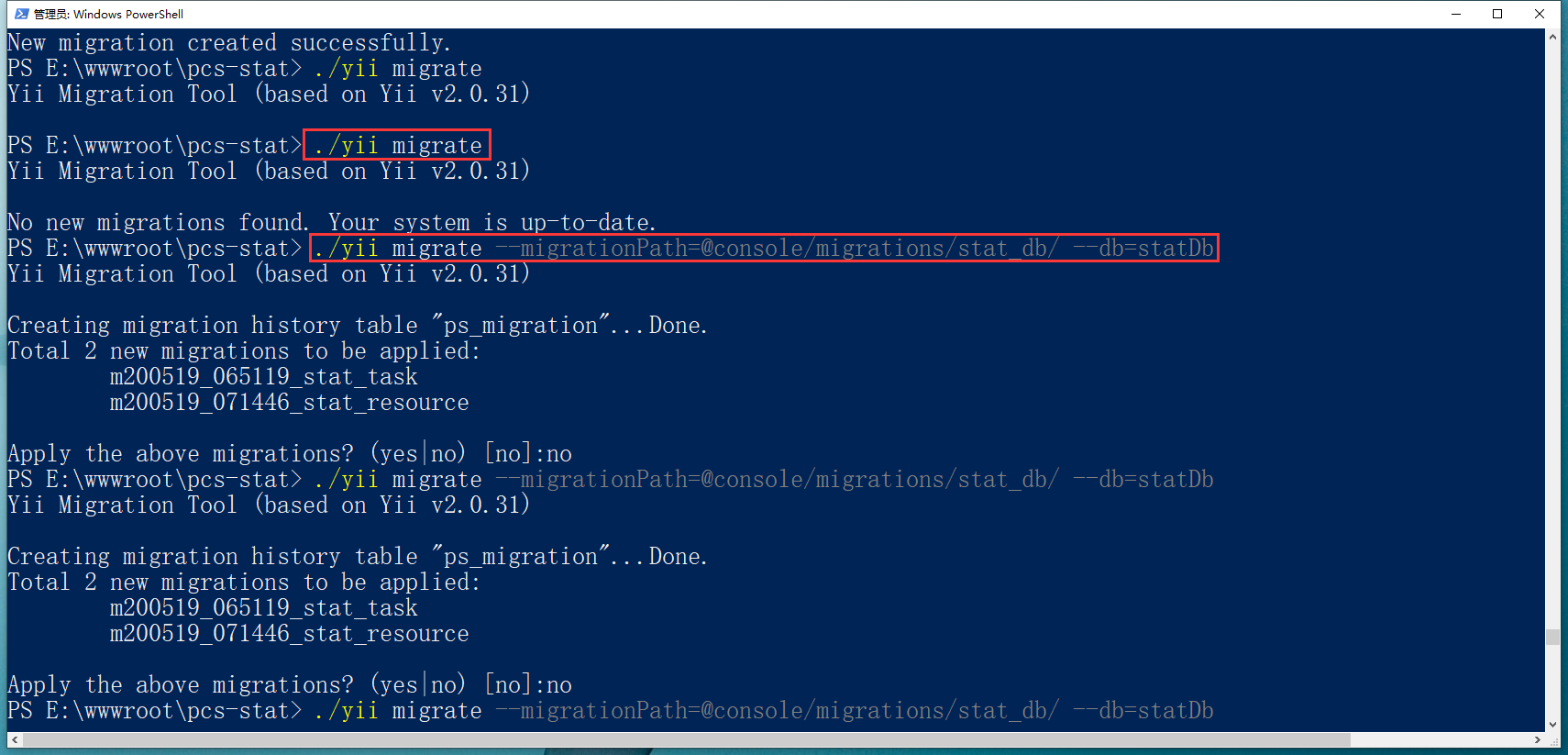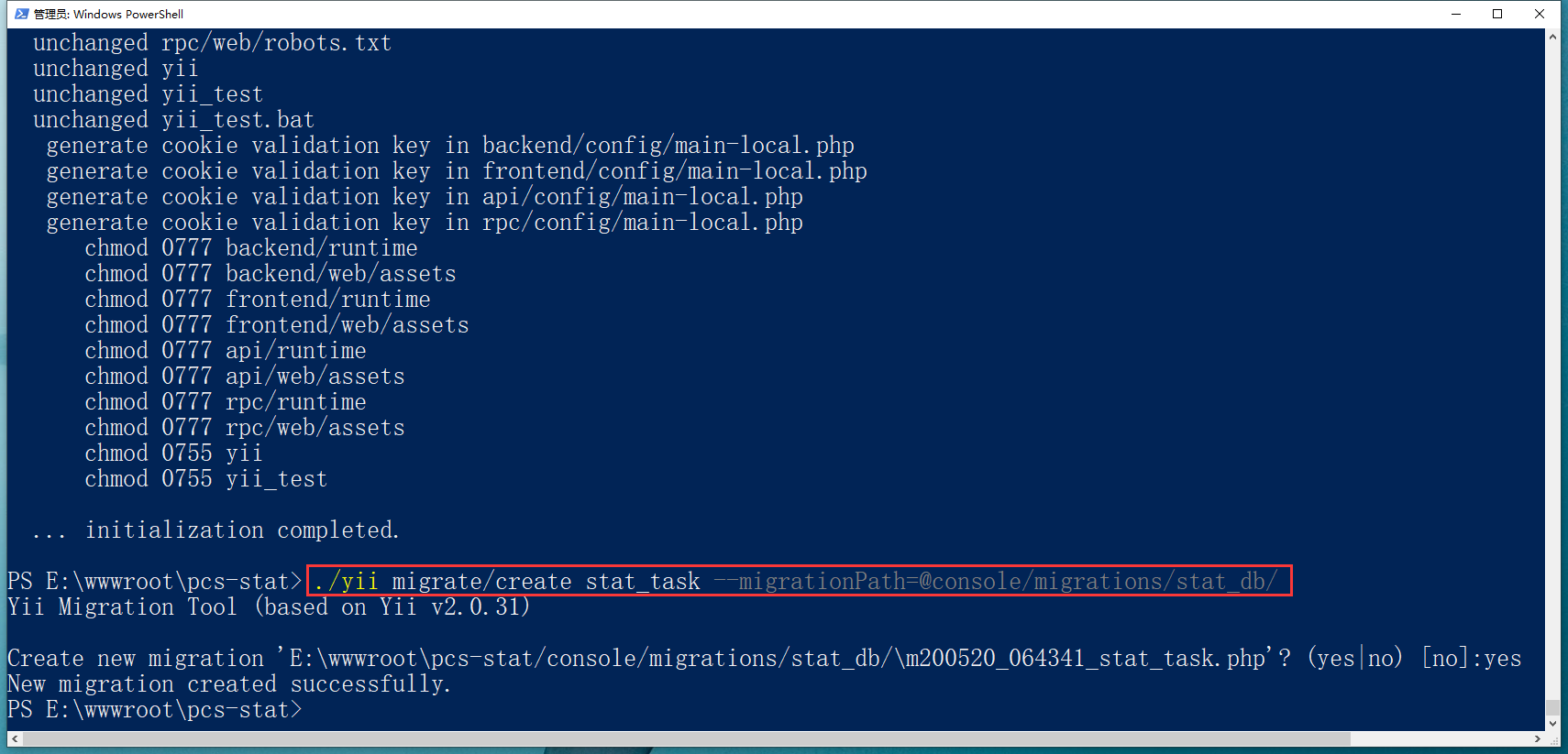 PS E:\wwwroot\pcs-stat> ./yii migrate/create stat_task --migrationPath=@console/migrations/stat_db/ Yii Migration Tool (based on Yii v2.0.31) Create new migration 'E:\wwwroot\pcs-stat/console/migrations/stat_db/\m200520_064341_stat_task.php'? (yes|no) [no]:yes New migration created successfully.