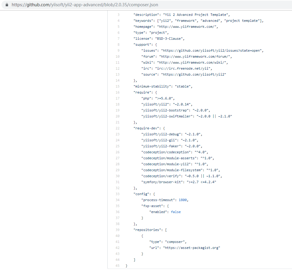 2、由于使用的是 Yii 2 高级项目模板,查看 GitHub 上的 composer.json,发现已经没有依赖:codeception/base,参考:https://github.com/yiisoft/yii2-app-advanced/blob/2.0.35/composer.json ,如图2