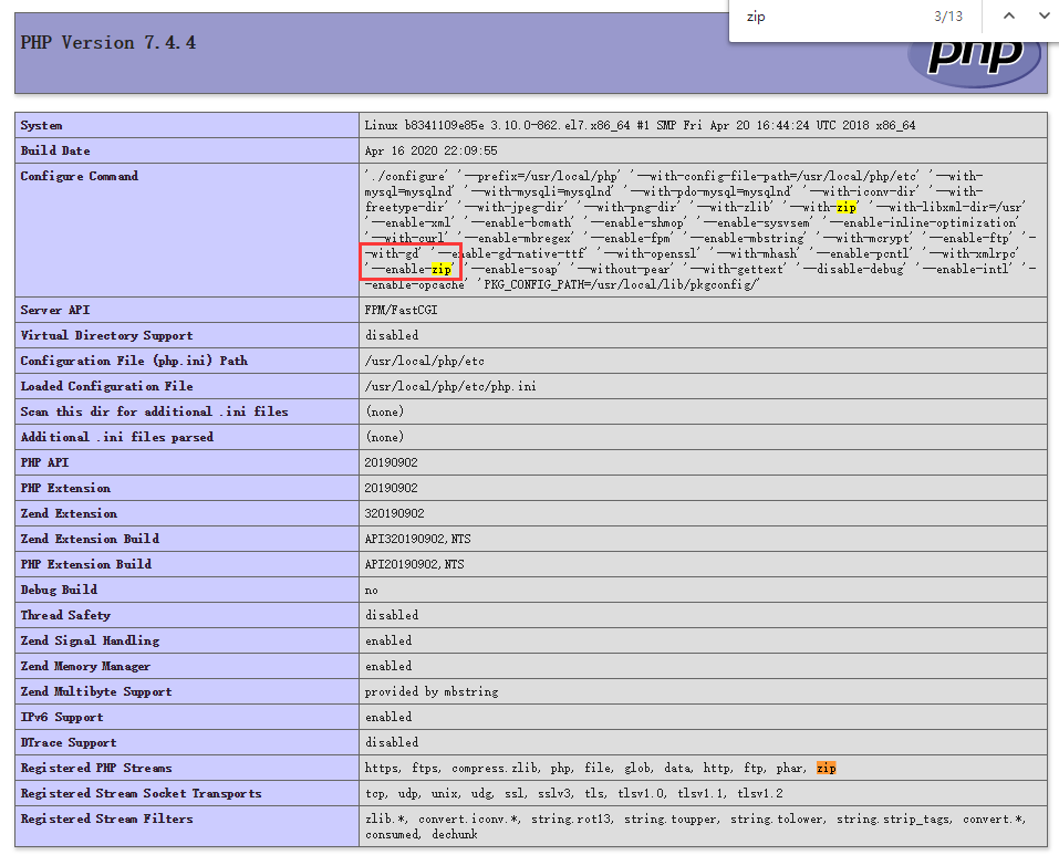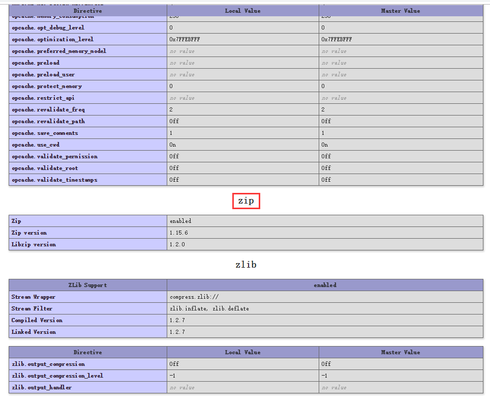 2、查看 phpinfo() 的信息,确认 zip 扩展已经安装。如图2