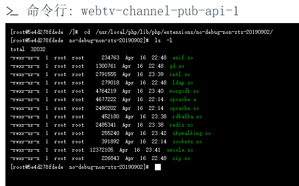 [root@5e4d278fdede /]# cd /usr/local/php/lib/php/extensions/no-debug-non-zts-20190902/ [root@5e4d278fdede no-debug-non-zts-20190902]# ls -l total 32032 -rwxr-xr-x 1 root root 234763 Apr 16 22:48 exif.so -rwxr-xr-x 1 root root 1300761 Apr 16 22:48 gd.so -rwxr-xr-x 1 root root 2791555 Apr 16 23:39 intl.so -rwxr-xr-x 1 root root 279018 Apr 16 22:48 ldap.so -rwxr-xr-x 1 root root 4764219 Apr 16 23:40 mongodb.so -rwxr-xr-x 1 root root 4677222 Apr 16 22:14 opcache.a -rwxr-xr-x 1 root root 2490202 Apr 16 22:14 opcache.so -rwxr-xr-x 1 root root 452180 Apr 16 23:38 rdkafka.so -rwxr-xr-x 1 root root 2485341 Apr 16 23:38 redis.so -rwxr-xr-x 1 root root 255240 Apr 16 23:42 skywalking.so -rwxr-xr-x 1 root root 391892 Apr 16 22:14 sockets.so -rwxr-xr-x 1 root root 12372105 Apr 16 23:41 swoole.so -rwxr-xr-x 1 root root 226843 Apr 16 22:48 zip.so