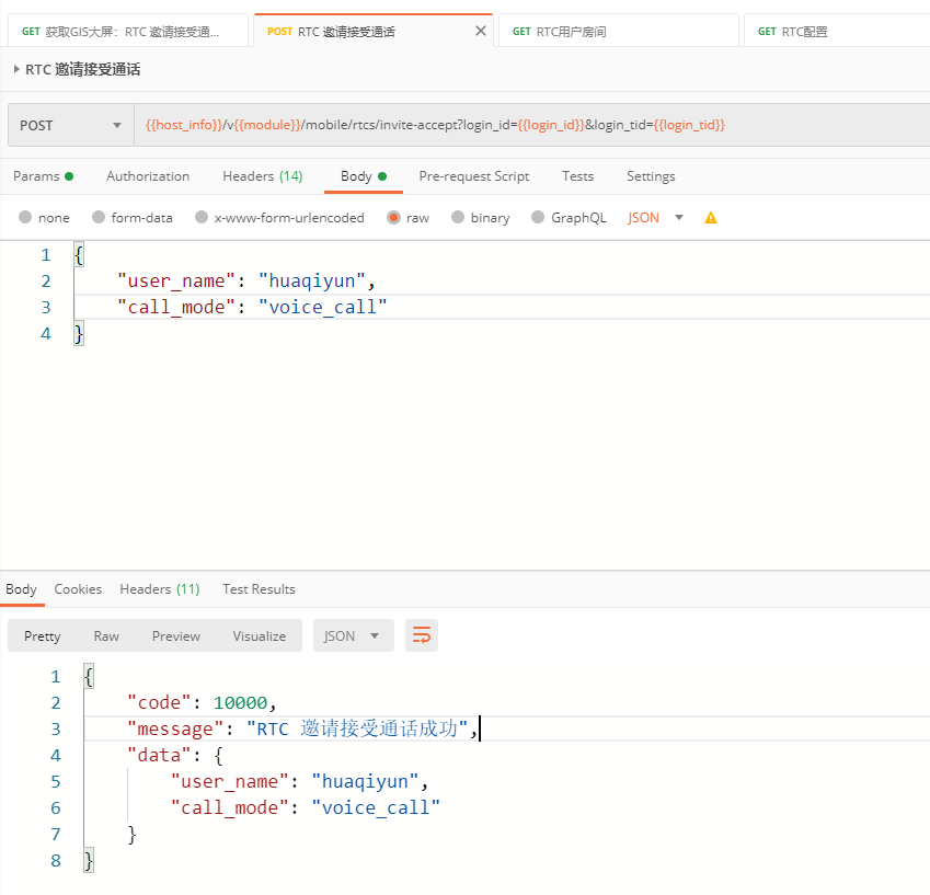 1、在 Postman 中 POST:http://api.pcs-api.localhost/v1/mobile/rtcs/invite-accept ,将 Body 中的数据以数组的格式写入 Redis 缓存中,如图1