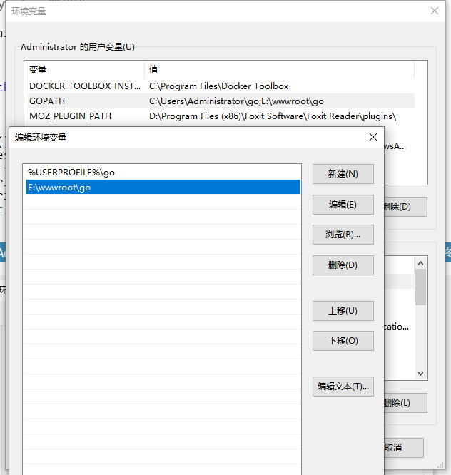 2、编辑环境变量 – Administrator 的用户变量 – GOPATH,其原值为:C:\Users\Administrator\go,新建:E:\wwwroot\go。其新值为:C:\Users\Administrator\go;E:\wwwroot\go。如图1