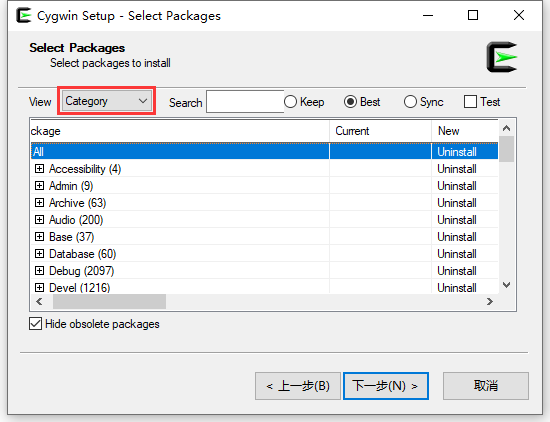 9、决定下载最新版本的安装包:http://www.cygwin.com/setup-x86_64.exe 。然后再次重复上述步骤。最新版本的安装包,未再报错。成功进入 Select Packages 界面。如图9