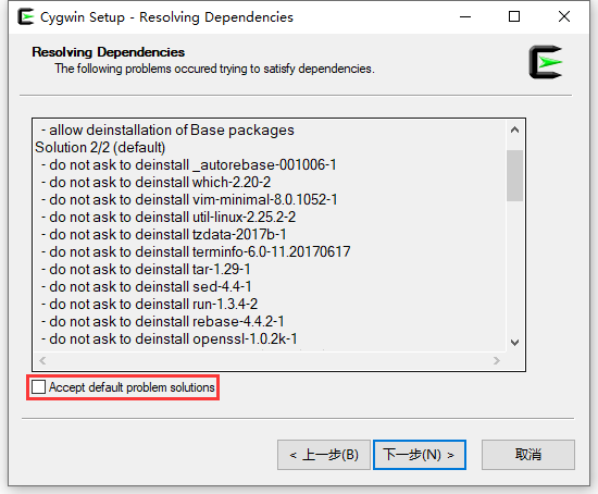 14、在 Resolving Dependencies 页面中,取消勾选 Accept default problem solutions。即不接受默认问题解决方案。全部卸载。如图14