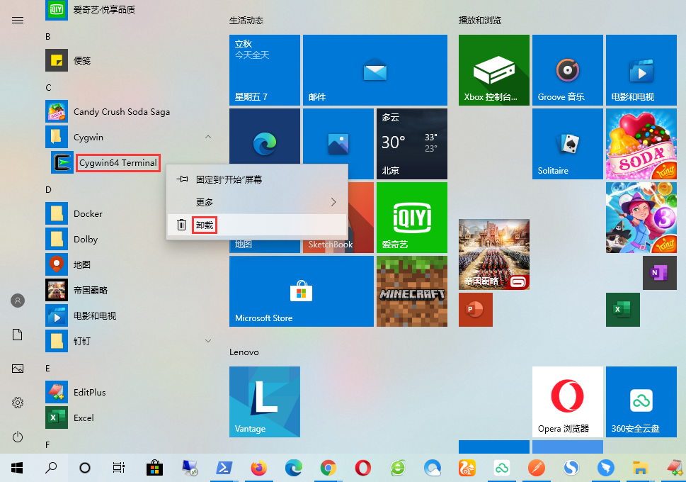 2、在导航中找到 Cygwin64 Terminal,右键 – 卸载。如图2