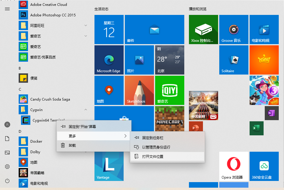 22、在系统菜单中仍然存在:Cygwin – Cygwin64 Terminal。右键 – 更多 – 打开文件位置。如图22