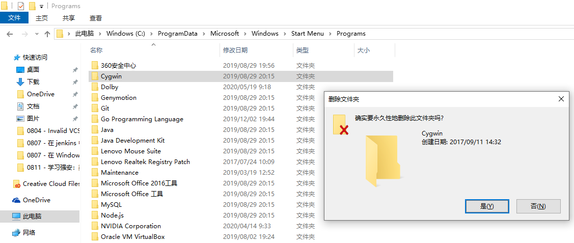 19、Shift + Delete 强制删除安装目录:C:\cygwin64。为所有当前项目执行此操作。是。彻底删除成功。如图19