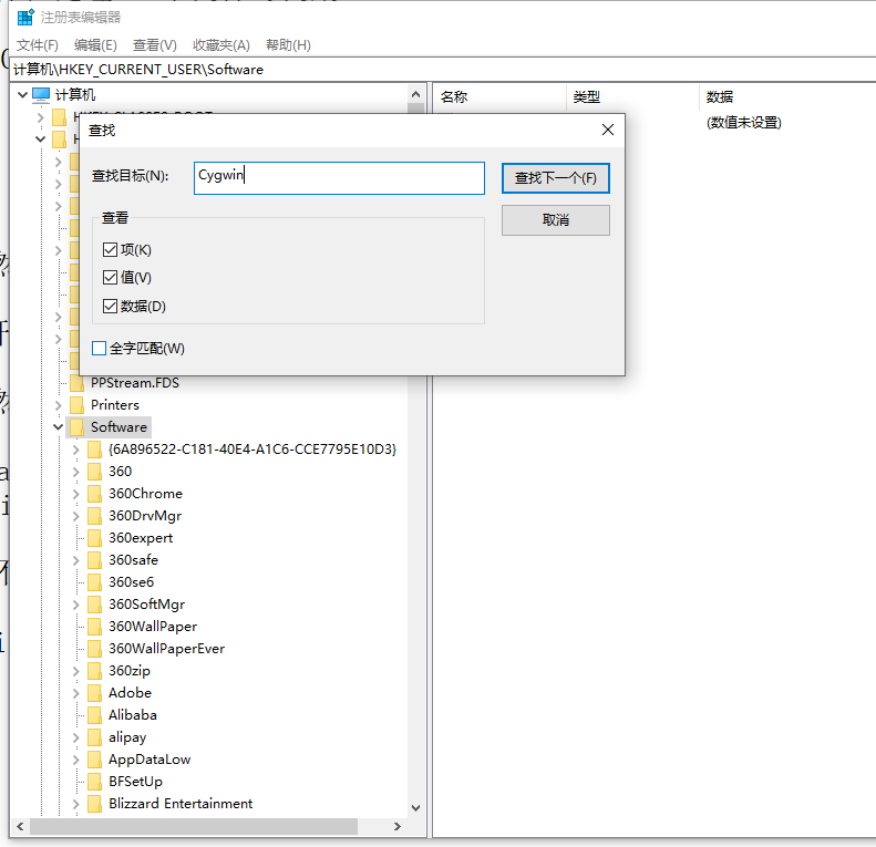 25、在注册表中查找:Cygwin,无结果。到此为止,在 Windows 10 64 位中已经彻底卸载 Cygwin。如图25