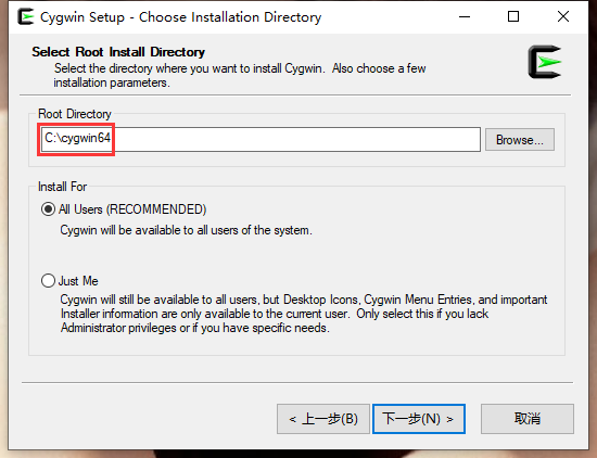6、选择 Cygwin 的之前安装的目录,默认为:C:\cygwin64,无需改动。如图6