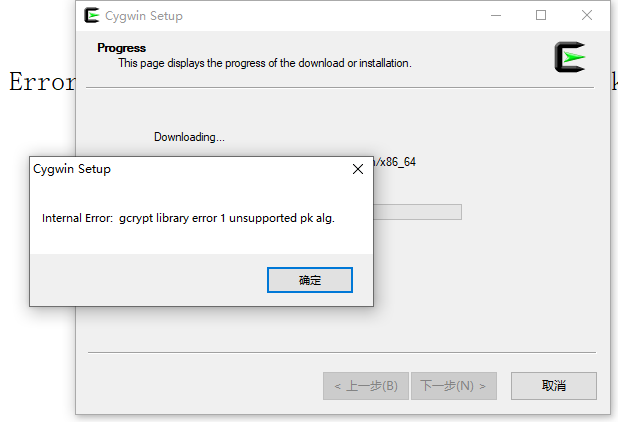 8、进展。该页面显示下载或安装的进度。报错:Internal Error: gcrypt library error 1 unsupported pk alg.。如图8