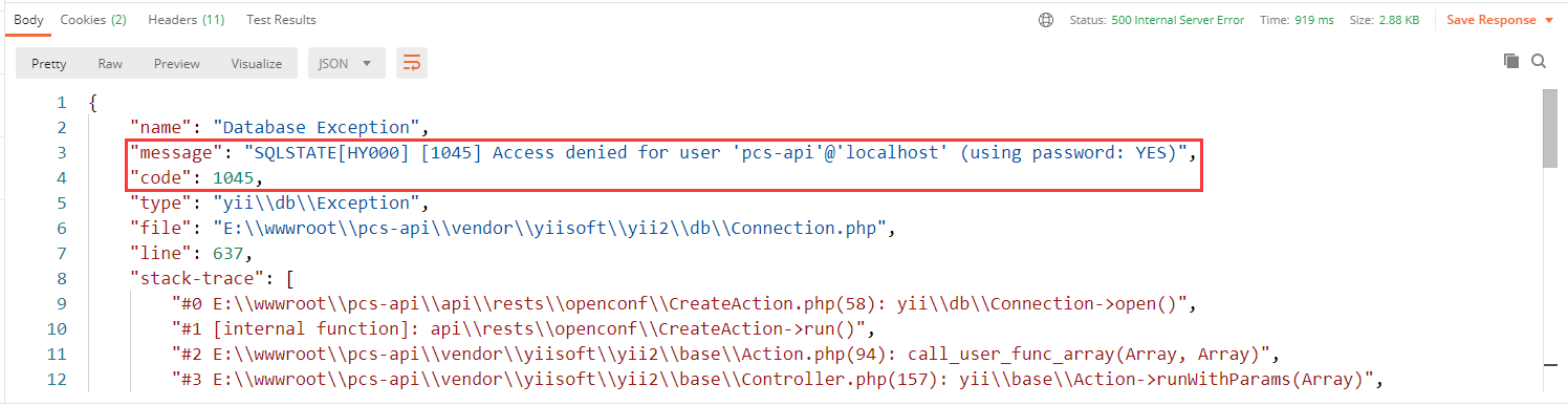 "#0 E:\\wwwroot\\pcs-api\\api\\rests\\openconf\\CreateAction.php(58): yii\\db\\Connection->open()",