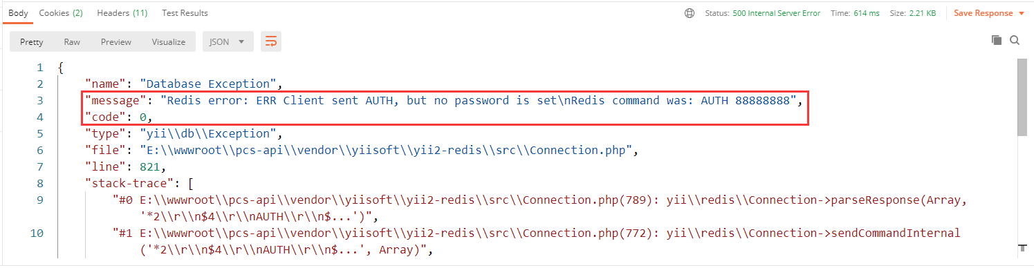 6、将 redis 的密码修改为错误的,响应 500 如下,符合预期。将 Yii::$app->redis->open(); 替换为:Yii::$app->redis->ping() ,响应是一样的,原因为在执行 ping 命令之前,需要先执行 open()。如图3