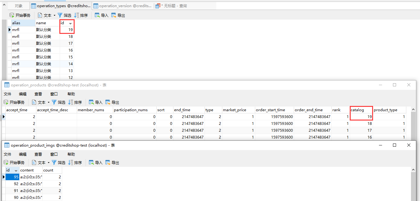 3、查看表:operation_types,其最后一条记录的:id 的值为 19。查看表:operation_products,其最后一条记录的:catalog 的值为 19。查看表:operation_product_imgs,其最后一条记录的:id 的值为 95。如图1