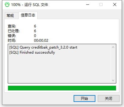4、运行 SQL 文件,[SQL] Query creditbak_patch_3.2.0 start。[SQL] Finished successfully。成功运行。如图2