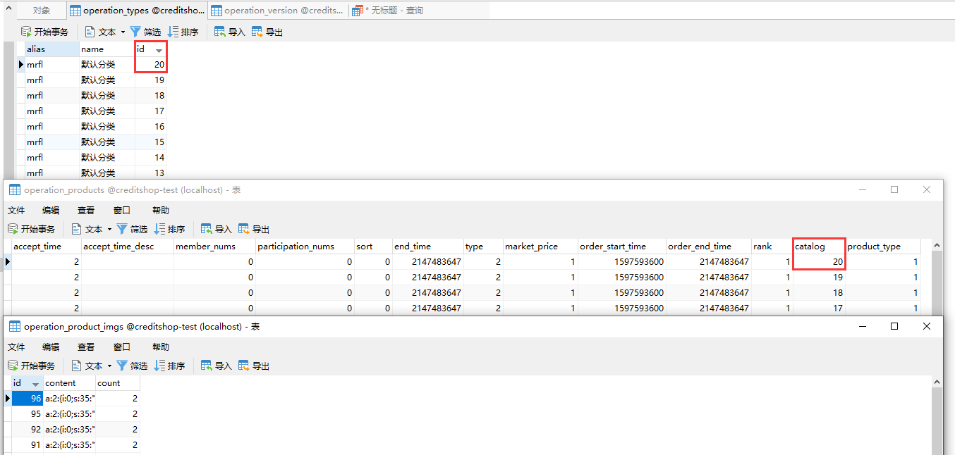 5、查看表:operation_types,其最后一条记录的:id 的值为 20。查看表:operation_products,其最后一条记录的:catalog 的值为 20。查看表:operation_product_imgs,其最后一条记录的:id 的值为 96。符合预期。如图3