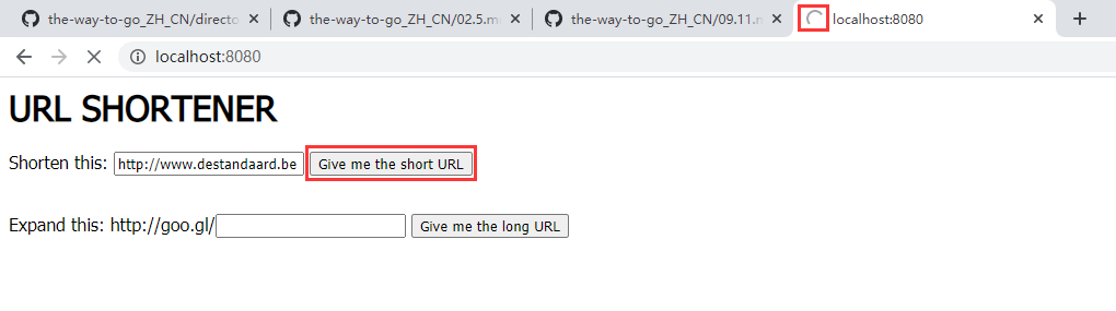 1、参考网址:https://github.com/unknwon/the-way-to-go_ZH_CN/blob/master/eBook/09.11.md 。通过浏览 http://localhost:8080/ 的页面来测试。在 Shorten this 中输入:http://www.destandaard.be ,点击:Give me the short URL。一直加载中,直至超时。如图1
