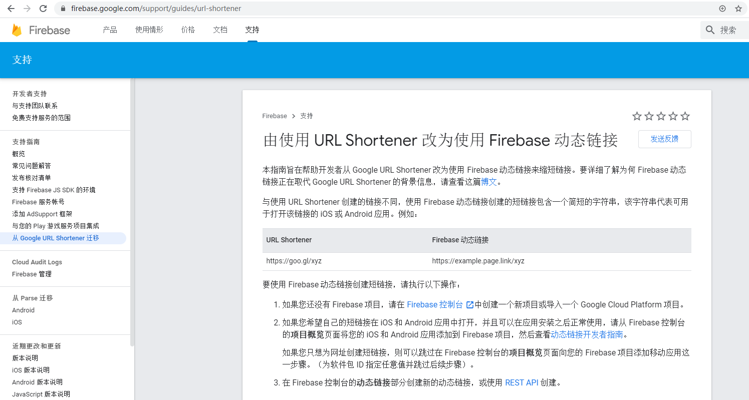 4、对于希望迁移到 FDL 的开发人员,请参阅我们的迁移指南。点击链接:our migration guide。由使用 URL Shortener 改为使用 Firebase 动态链接。如图4