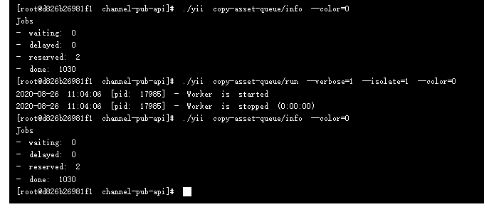 [root@d826b26981f1 channel-pub-api]# ./yii copy-asset-queue/info --color=0 Jobs - waiting: 0 - delayed: 0 - reserved: 2 - done: 1030 [root@d826b26981f1 channel-pub-api]# ./yii copy-asset-queue/run --verbose=1 --isolate=1 --color=0 2020-08-26 11:04:06 [pid: 17985] - Worker is started 2020-08-26 11:04:06 [pid: 17985] - Worker is stopped (0:00:00) [root@d826b26981f1 channel-pub-api]# ./yii copy-asset-queue/info --color=0 Jobs - waiting: 0 - delayed: 0 - reserved: 2 - done: 1030