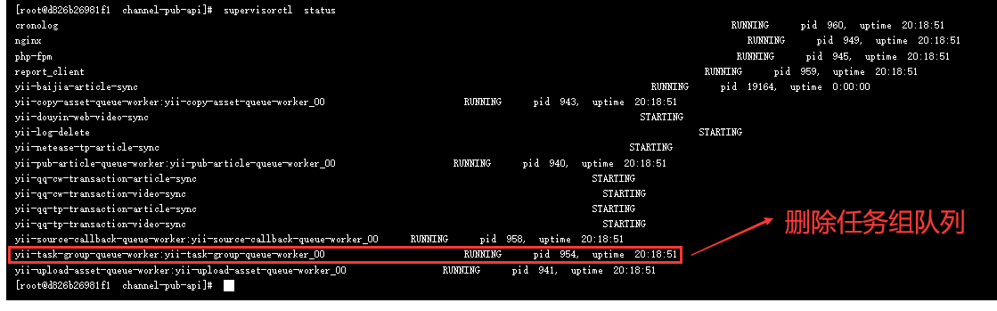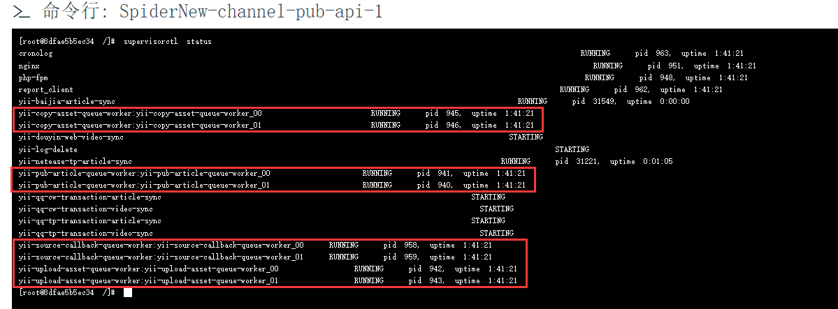 [root@d826b26981f1 channel-pub-api]# supervisorctl status cronolog RUNNING pid 960, uptime 20:18:51 nginx RUNNING pid 949, uptime 20:18:51 php-fpm RUNNING pid 945, uptime 20:18:51 report_client RUNNING pid 959, uptime 20:18:51 yii-baijia-article-sync RUNNING pid 19164, uptime 0:00:00 yii-copy-asset-queue-worker:yii-copy-asset-queue-worker_00 RUNNING pid 943, uptime 20:18:51 yii-douyin-web-video-sync STARTING yii-log-delete STARTING yii-netease-tp-article-sync STARTING yii-pub-article-queue-worker:yii-pub-article-queue-worker_00 RUNNING pid 940, uptime 20:18:51 yii-qq-cw-transaction-article-sync STARTING yii-qq-cw-transaction-video-sync STARTING yii-qq-tp-transaction-article-sync STARTING yii-qq-tp-transaction-video-sync STARTING yii-source-callback-queue-worker:yii-source-callback-queue-worker_00 RUNNING pid 958, uptime 20:18:51 yii-task-group-queue-worker:yii-task-group-queue-worker_00 RUNNING pid 954, uptime 20:18:51 yii-upload-asset-queue-worker:yii-upload-asset-queue-worker_00 RUNNING pid 941, uptime 20:18:51