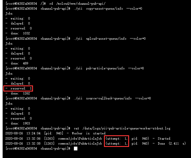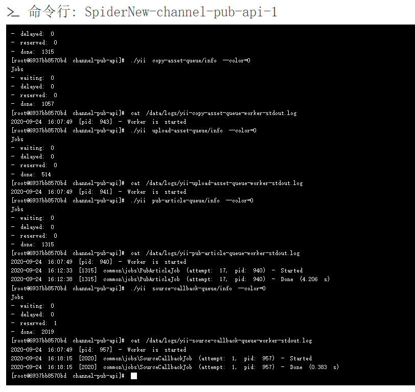 [root@04302a060834 /]# cd /mcloud/www/channel-pub-api/ [root@04302a060834 channel-pub-api]# ./yii copy-asset-queue/info --color=0 Jobs - waiting: 0 - delayed: 0 - reserved: 0 - done: 1032 [root@04302a060834 channel-pub-api]# ./yii upload-asset-queue/info --color=0 Jobs - waiting: 0 - delayed: 0 - reserved: 0 - done: 489 [root@04302a060834 channel-pub-api]# ./yii pub-article-queue/info --color=0 Jobs - waiting: 0 - delayed: 0 - reserved: 1 - done: 1262 [root@04302a060834 channel-pub-api]# ./yii source-callback-queue/info --color=0 Jobs - waiting: 0 - delayed: 0 - reserved: 0 - done: 1903 [root@04302a060834 channel-pub-api]# cat /data/logs/yii-pub-article-queue-worker-stdout.log 2020-08-26 13:24:04 [pid: 940] - Worker is started 2020-08-26 13:32:06 [1263] common\jobs\PubArticleJob (attempt: 1, pid: 940) - Started 2020-08-26 13:32:08 [1263] common\jobs\PubArticleJob (attempt: 1, pid: 940) - Done (2.411 s)