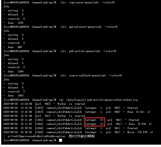 [root@04302a060834 channel-pub-api]# ./yii copy-asset-queue/info --color=0 Jobs - waiting: 0 - delayed: 0 - reserved: 0 - done: 1032 [root@04302a060834 channel-pub-api]# ./yii upload-asset-queue/info --color=0 Jobs - waiting: 0 - delayed: 0 - reserved: 0 - done: 489 [root@04302a060834 channel-pub-api]# ./yii pub-article-queue/info --color=0 Jobs - waiting: 0 - delayed: 0 - reserved: 0 - done: 1264 [root@04302a060834 channel-pub-api]# ./yii source-callback-queue/info --color=0 Jobs - waiting: 0 - delayed: 0 - reserved: 2 - done: 1903 [root@04302a060834 channel-pub-api]# cat /data/logs/yii-pub-article-queue-worker-stdout.log 2020-08-26 13:24:04 [pid: 940] - Worker is started 2020-08-26 13:32:06 [1263] common\jobs\PubArticleJob (attempt: 1, pid: 940) - Started 2020-08-26 13:32:08 [1263] common\jobs\PubArticleJob (attempt: 1, pid: 940) - Done (2.411 s) 2020-08-26 14:21:49 [pid: 941] - Worker is started 2020-08-26 15:11:49 [1262] common\jobs\PubArticleJob (attempt: 27, pid: 941) - Started 2020-08-26 15:11:52 [1262] common\jobs\PubArticleJob (attempt: 27, pid: 941) - Done (2.534 s) 2020-08-26 15:29:52 [1264] common\jobs\PubArticleJob (attempt: 1, pid: 941) - Started 2020-08-26 15:30:02 [1264] common\jobs\PubArticleJob (attempt: 1, pid: 941) - Error (10.575 s) > yii\web\UnprocessableEntityHttpException: 图片文件超过1M限制
