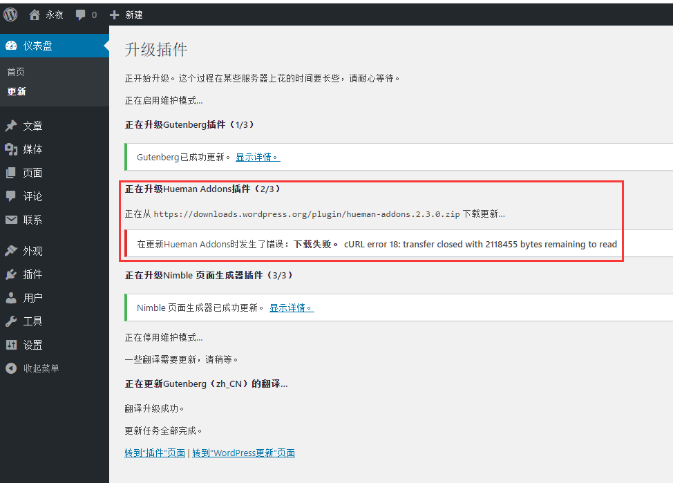 1、在更新Hueman Addons时发生了错误:下载失败。 cURL error 18: transfer closed with 2118455 bytes remaining to read。如图1